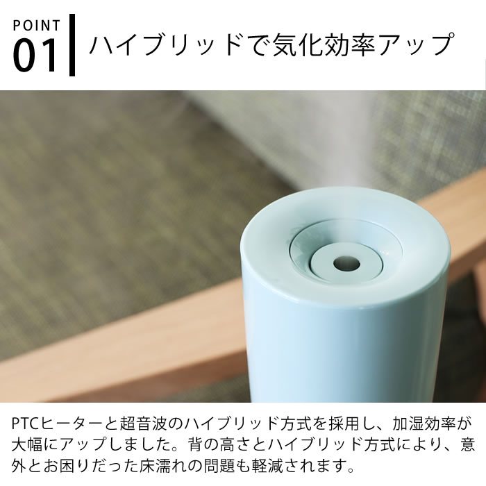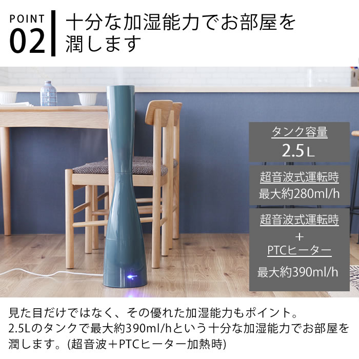 超音波式とPTCヒーターの両方を採用することで気化効率がアップし、お部屋を潤します。
