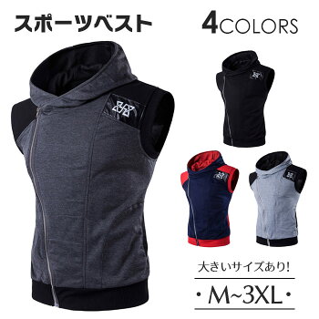 【送料無料】即納 フード付ベスト メンズ ベスト ノースリーブ トップス ジップアップ パーカー トレーニング ジム ヨガ ランニング スポーツ インナー ベスト パーカーベスト フード付き 男性 カジュアル