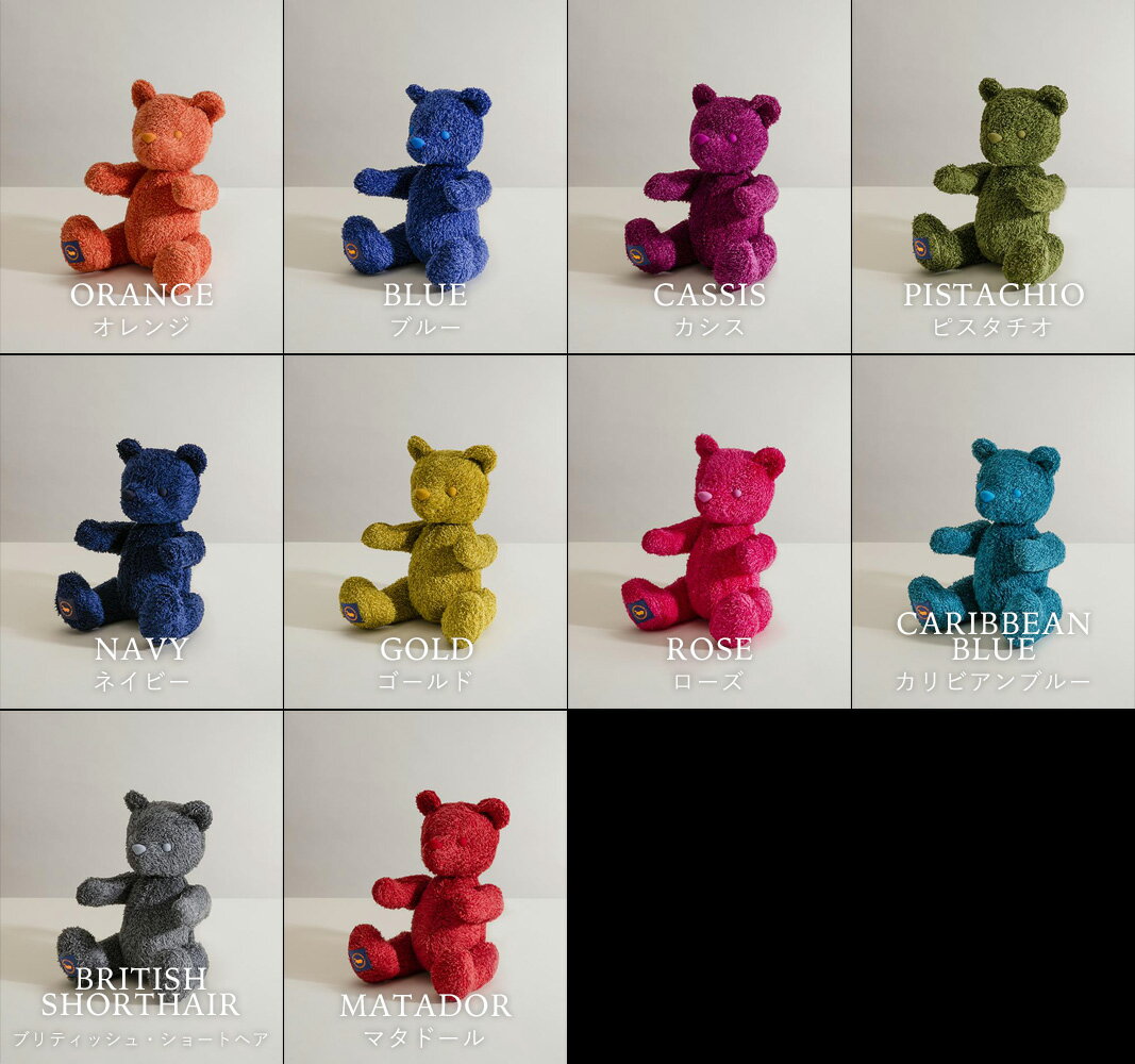 ▼商品仕様 サイズ(着座) : 横17×縦15×高さ23cm カラー : オレンジ、ブルー、ネイビー、カシス、ピスタチオ、ゴールド、ローズ、カリビアンブルー、ブリティッシュ・ショートヘア、マタドール タオル素材 : 有機栽培綿 63% + 再生竹繊維 37% 中綿素材 : ポリエステル 100% スカーフ素材 : コットン 100% 製造国 : 日本 画面によってモニターの色と商品の色とが異なって見えることがあります。