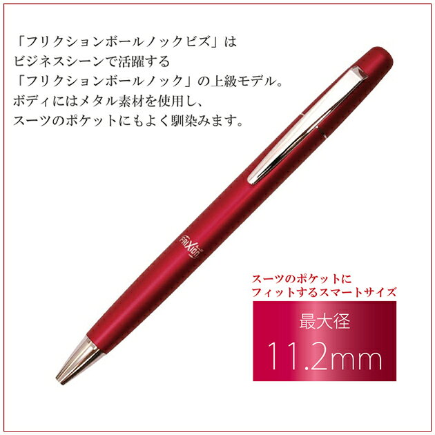 【サイズ】最大径:φ11.2mm、全長:142mm【重量】24.5g【材質】軸:黄銅(塗装)【軸色】ボルドー【ボール径】0.5mm【仕様】クリップスライドノック式【インク】黒大人気のフリクションボールノックに金属ボディを採用。